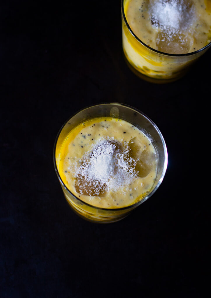 - In 2 medium glasses, add 1/2 passionfruit into the bottom of the glass