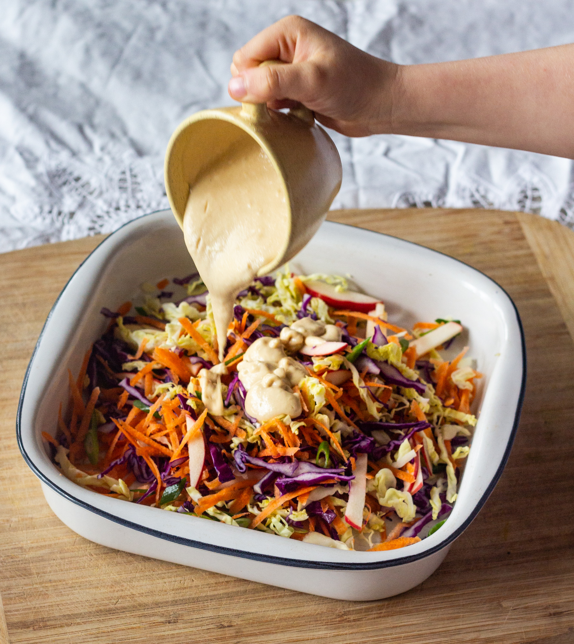 - Once a desired consistency, pour onto the slaw ingredients and mix really well to combine.